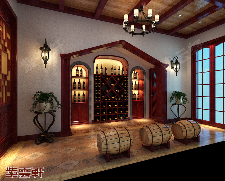 酒窖,在红木酒柜的加持下,琳琅满目的珍藏红酒在特定环境中更加优雅,值得品味。