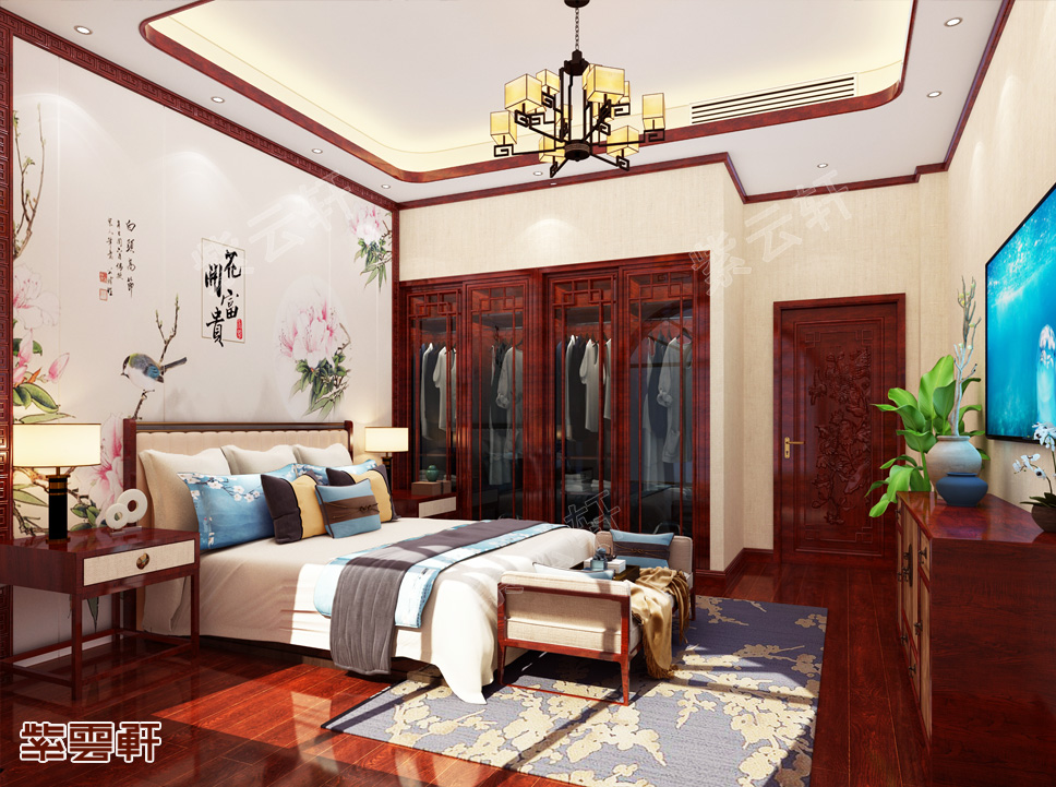 卧室,整套房子的户型非常完美,卧室空间也比较大,各种中式元素巧妙兼糅,唤活空间风雅的氛围。比如这套嵌入墙体的红木衣柜,好看又实用,还很节省空间。装饰墙面的花鸟彩绘寓意美好,形态美观。现代吊灯结合红木线条装饰的天花板,摆脱压抑气氛的同时,保留传统中式设计的气韵,低调又有格调。