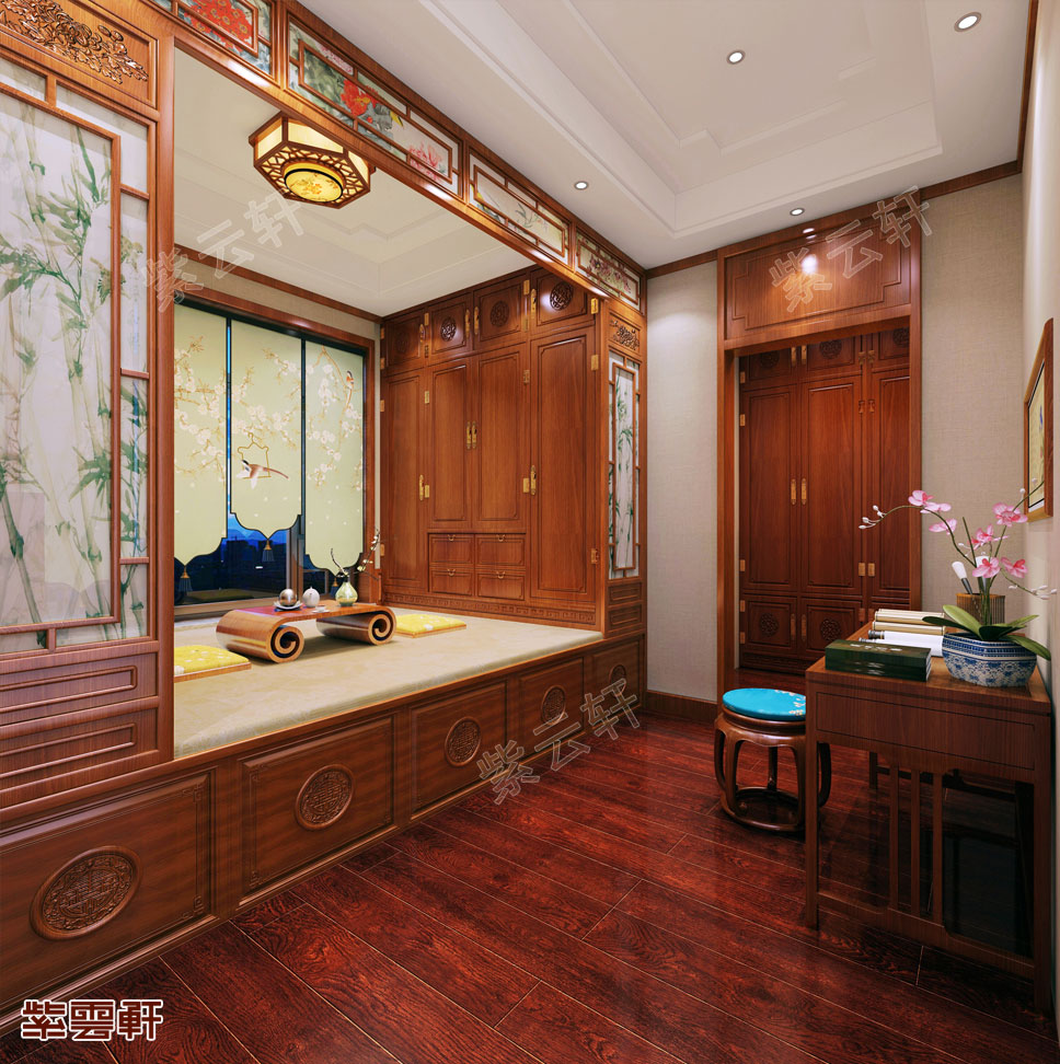 老人房,处处可见的红木元素,再搭配复古感十足的榻榻米设计,显得十分有格调。柜子上选择了淡雅的水墨翠竹点缀,加上实木的家具构成了舒适大方的休息空间,让人感觉非常放松沉稳。