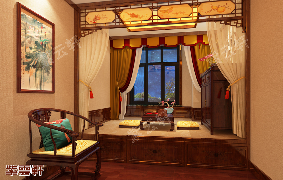暖阁,小巧精致的暖阁同样采用天然原木制造,木质柜体和柜门显露出光滑的表面和原始的肌理,搭配温暖的榻榻米与清雅的窗帘,营造出小型休息室的精致感与温馨感,在居家使用上更方便、舒适。