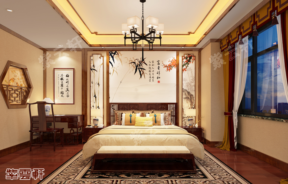 卧室,诗面写竹,竹之直节挺立,犹君子之风,千村万陌,无处不有。床头背景图以竹为主题,彰显气节,虽不粗壮,但却正直,坚韧挺拔,不惧严寒酷暑,忘古长青。中式别墅设计在布局时善于运用这些中式元素,更是人们对于美好生活的向往。