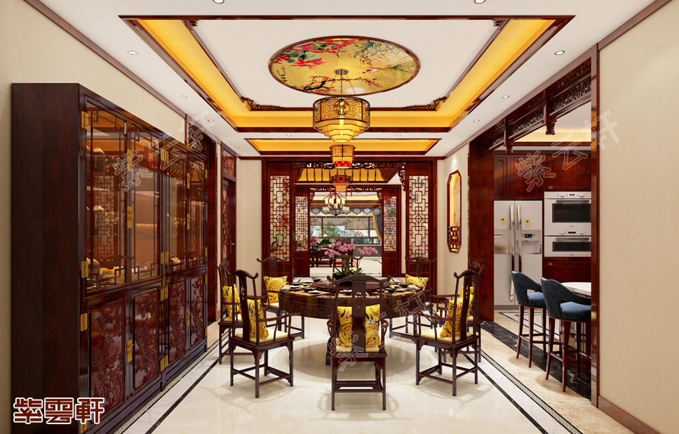 餐厅,墙面采用简单的素色壁纸搭配红木踢脚线快速营造出质朴风格,餐桌以及橱柜刻意选用红木质地的传统家具,天花板中加入古风画元素,巧妙搭配下平衡空间色调,让用餐空间不至于压抑死板,又能展现中式的典雅风采。