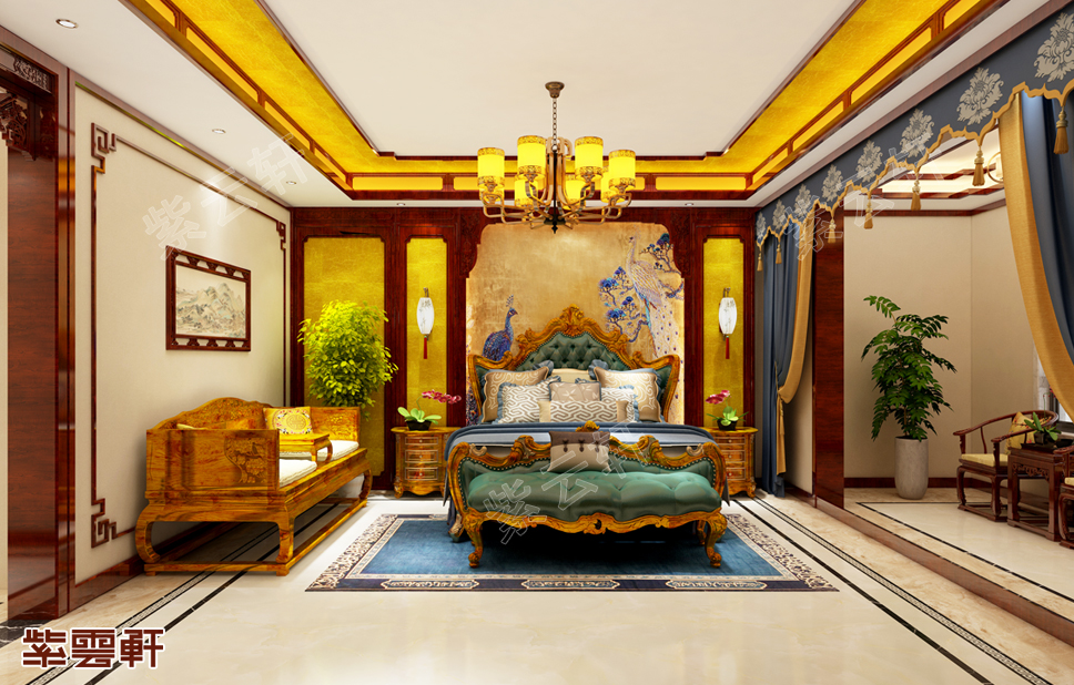 卧室,中式装饰卧室强调尊贵华丽的宫廷感,大面积的金黄色系灯面墙纸让空间看上去非常华丽,搭配光亮的大理石地板,风格激进又不失特色,流苏壁灯、红木床铺、罗汉床等等家具在视觉表现上也能展示出中式古典风格的风采。
