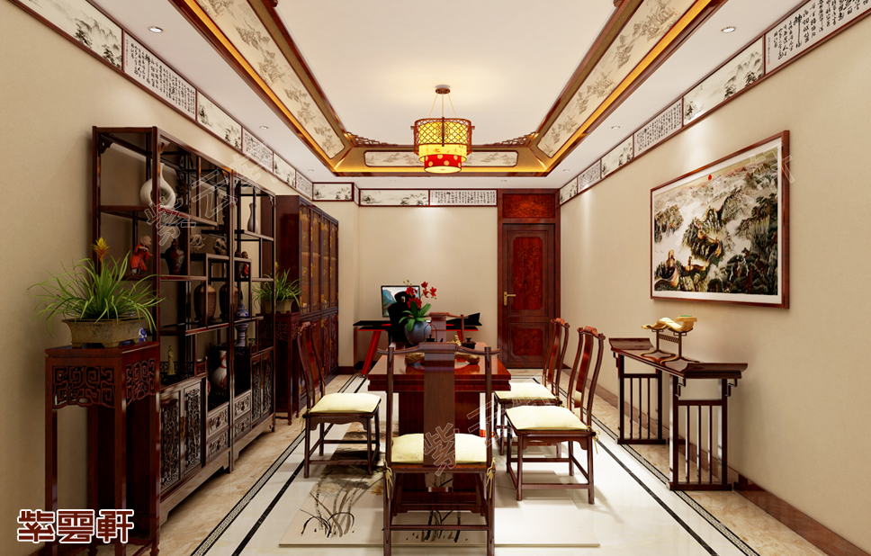 茶室,雕工精湛的红木博古架造型非常古典,吊顶上的红木边框与书法装饰等中式元素带有古朴而厚重气息,摆放整齐的桌椅,飘逸隽秀的书画装饰,这些带有鲜明的中式符号的家具装饰,传递出传统中式装修优雅庄重的气质氛围。