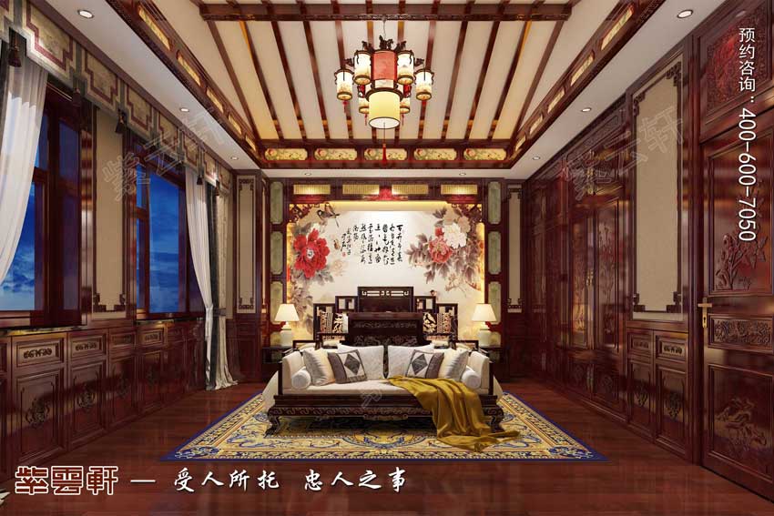 卧室,大面积枣红色花雕板材墙面设计,丰富的雕花造型搭配红木地板,立即成为一间庄重大气的中式卧室。特色的水墨牡丹壁纸给卧室带来不凡的艺术感,让原本大面积空间更显大气,营造让人为之惊呼的空间质感,中式风格装饰让整个空间华丽高贵。