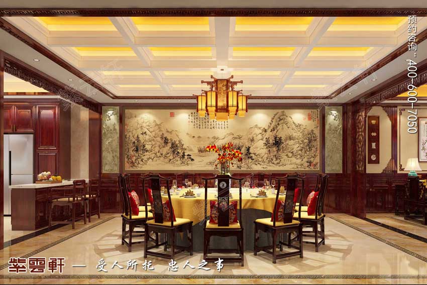 餐厅,一张五福如意圆台餐桌安放在宽敞的空间中,作为典型的明式家具,其强大的气场非常适应这个阔气的空间,再搭配墙面上的这一幅豪迈的山水画卷,把中式餐厅的豪华、尊贵的气质完整的塑造出来。