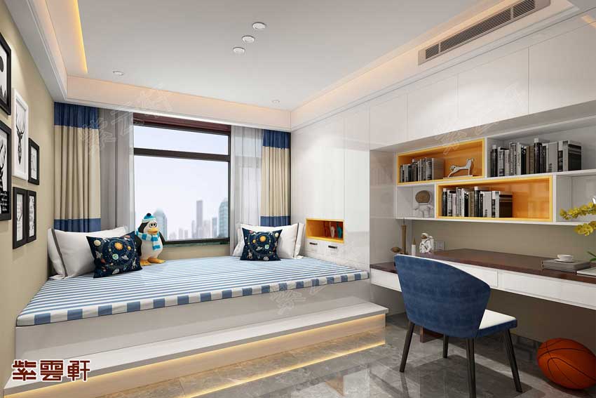 男孩房,以蓝色调为主,体现男性理性的一面,可爱的造型让人了解到房间的主人是一位少年,整个空间的效果异常的亮丽,淡蓝色的装扮更具有童真的美感。
