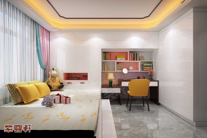 女儿房,整体格调以清新自然为主,窗帘也选用女儿们喜欢的粉色,一侧简易的书房方便工作和学习,没有多余的装饰,更能展现出中式风格的简约与质朴。