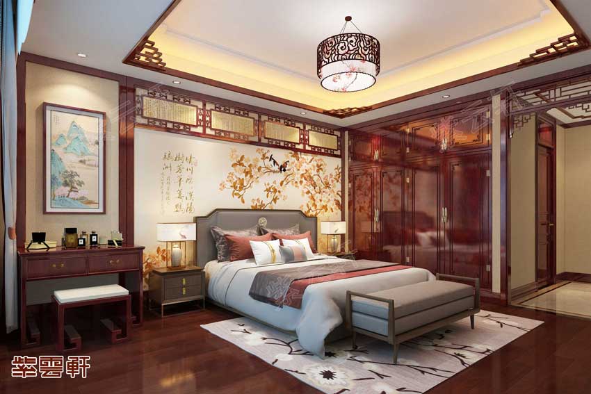 主卧,深沉饱满的色调创造出静谧温和的环境气氛,可以安抚身心的疲惫,红木搭配的墙面辅以深沉稳重的红木橱柜,优雅的气质弥漫在空间的每个角落之中。木质地板纹理美观,抗腐蚀性强,与整体的颜色设计完美融合,很有复古的味道。