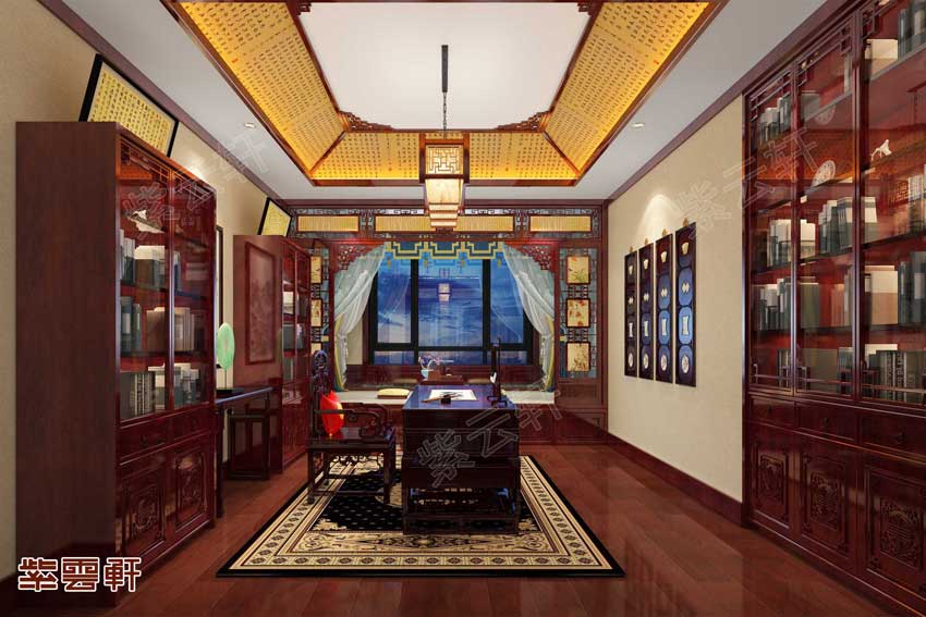书房,符合意境的中式书房要选择不同时期的红木家具,或者是从古典家具演变的中式家具,可营造出稳重的效果。书房对于窗户的要求比较严格,不仅仅要保证空气的流通,还可以引入自然光及户外的景色,在古典气息中得到一个清晰舒适的环境。