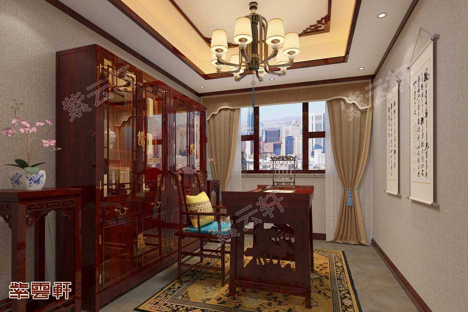 书房,现代风格的吊灯与墙纸、木料形成呼应,平衡空间色温,干净不多赘饰的天花板造型,大大提升空间质感。红木材质的书桌搭配稳重的书柜,中式韵味十足。墙面装饰书法挂饰,文雅的气氛瞬间提升,整个空间显得非常有格调。住宅装修中有这样一间书房也能提升整个家居环境的档次。