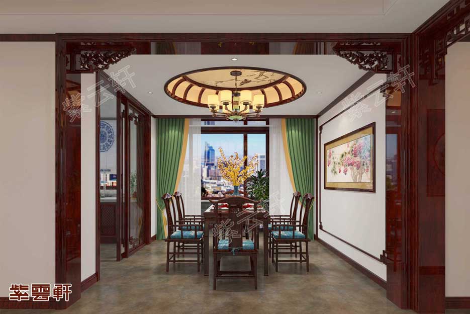 餐厅,枣红色的家具餐桌与绿色的休闲窗帘碰撞出强烈的视觉冲击感,增加了空间的色彩感与活泼度,搭配原木元素和水墨墙纸搭配而成的藻井设计,呈现出舒适的居家氛围。