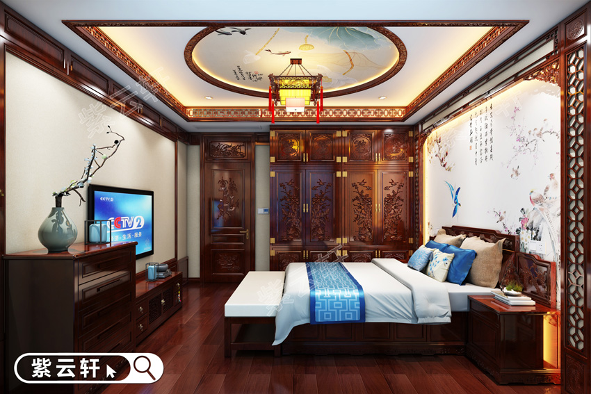 卧室,细腻的红木线条蔓延在空间的每个角落之中,让这间中式卧室整体包围着木质感,定制式的顶箱柜,柜门上雕刻精美的花纹,搭配艺术感十足的中式画背景墙,将中式风的古色古香挥洒到极致。