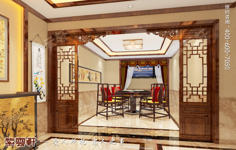 棋牌室,增加了家庭休闲生活的娱乐性,丰富的娱乐方式,也让居家生活变得休闲有趣。在家具的选材上,红木有一种檀香的味道,其香悠远醇厚,不张扬,材质也比较硬,搭配红色的靠背,棋牌室也能打造出这样迷人的光景,也让中式装修别墅更多的高级。