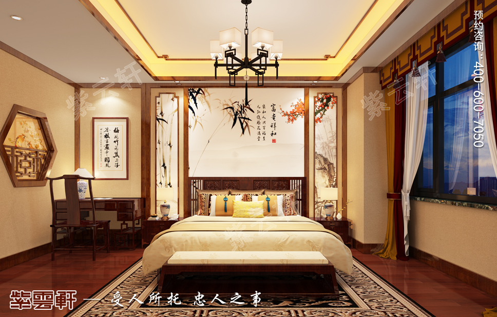 卧室,古典吊灯的设计是中式装修的一大特点,增强了整体的颜值,光照效果也很强。床头墙沿用之前的红木护墙板,配上中式墙纸,别墅设计装修中这样区分,既有干净利索的整洁效果,看着也更有品味。