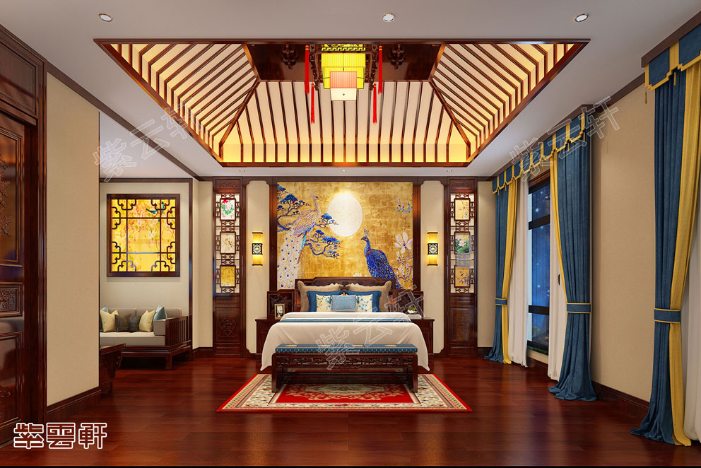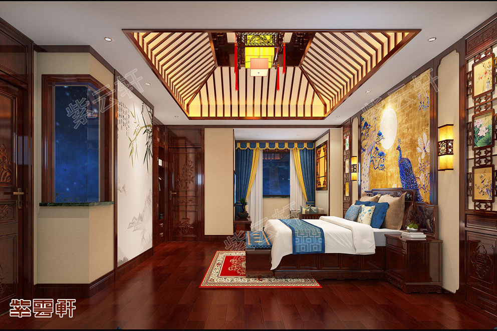 主卧,布置一张实木大床,睡着特别舒服。旁边有独立的阳台,空间看起来宽一些,也增加室内采光。顶面的红木木格藻井非常亮眼,颜值非常高,看着心情都很舒适,整个卧室都是铺的原木地板,中式别墅设计装修以原木色贯穿整个空间,真心喜欢这样的效果。