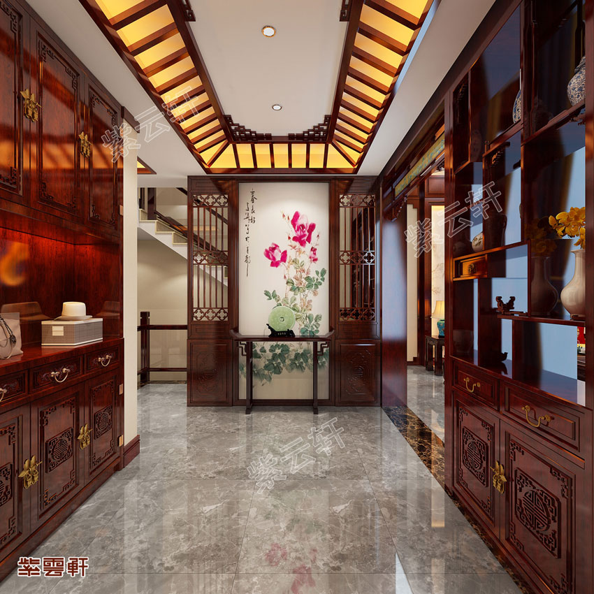 玄关,一面对称设计的入户艺术墙甚是醒目,红木花格的古典厚重感,使得空间彰显出令人舒心的安逸美感。左右各定制了一个分层的多宝阁,下面可以当鞋柜,上面能够展示一些房主的收藏品,实用又好看。