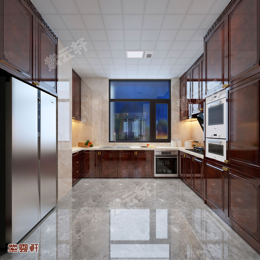 厨房,厨房不仅是一个做饭炒菜的地方,更能促进家人沟通,一起做饭更是一种乐趣。大面积的厨房可以让多人一些参加到劳动中来,嵌入式的冰箱与厨房用具让整个空间非常的干净整洁。