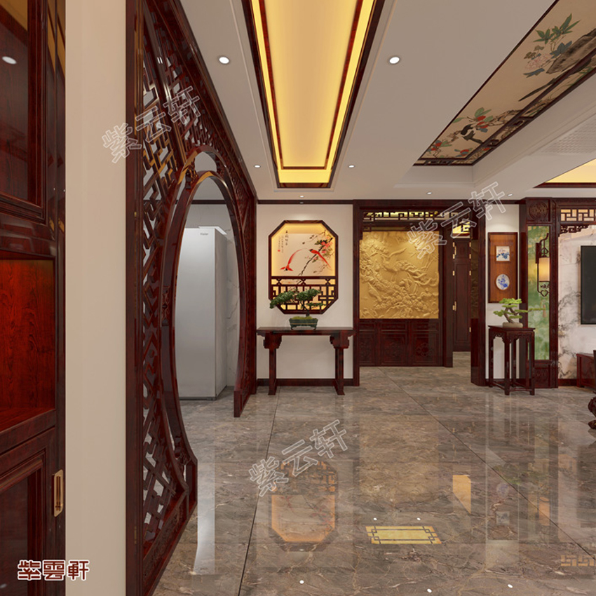 玄关,正对门的墙边做了一组端景,一方红木案台加上一个盆景,墙面上装饰了一套艺术墙,顶面做了一套长方形的吊顶,边上是一个红木材质的月洞门,可谓是处处都彰显着中式的质感,虽然颜色的上比较单一,选用古典风的格调,但是更显得奢华与大气。装修别墅就是要将传统的质感突出出来,才更显得与众不同。