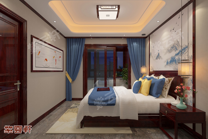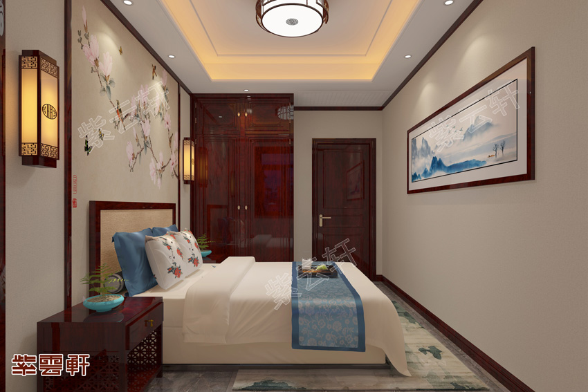 卧室,整面墙上带有树木群山的墙纸,利用深浅不一的颜色,营造出丰富的层次,在灯光的照射下格外的出色,奢华、尊贵、唯美都在简单的装饰中体现出来,坐在室内静观这迷人的风景,别有一番情趣。中式风格别墅装修既有传统的复古典雅,又有现代的时尚个性,在家居中领域深远厚重的传统文化。