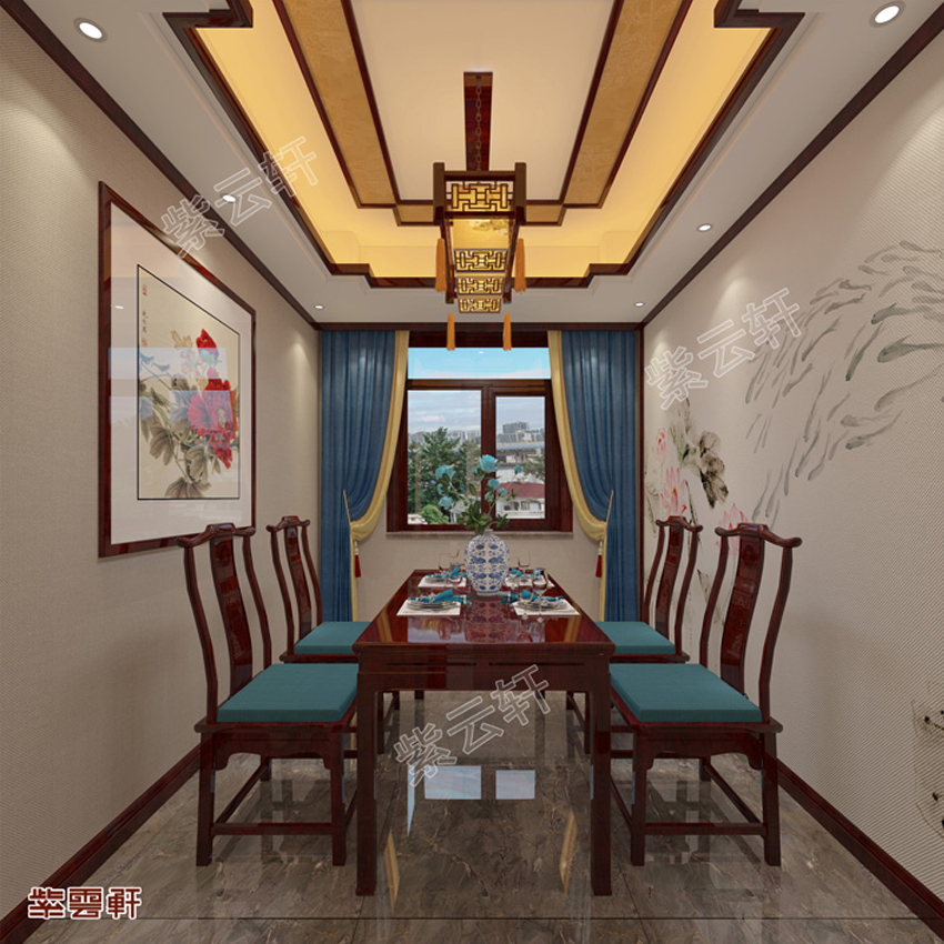 餐厅,红木餐桌给人的感觉特别自然、特别清新的感觉,加上色彩点缀的布艺坐垫,与原木家具完美搭配。对于中式装修来说,水墨元素是绕不过去的点,一整面的水墨艺术墙将空间的文艺范提升到了新的高度,顶面主灯加上射灯和筒灯,足够照明亮度。考虑到空间的布局,餐桌与仿古灯具均选择方形的,整体更加的协调。