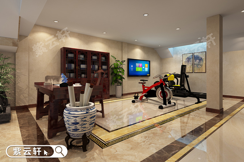 健身房,书房与现代健身器械的相互融合,造就了一幅别致景象,大理石地面的设计简约利落,在灯光的衬映下,烘托出温雅氛围,在这样的房间内过读书或锻炼都利于提升自己的气质。