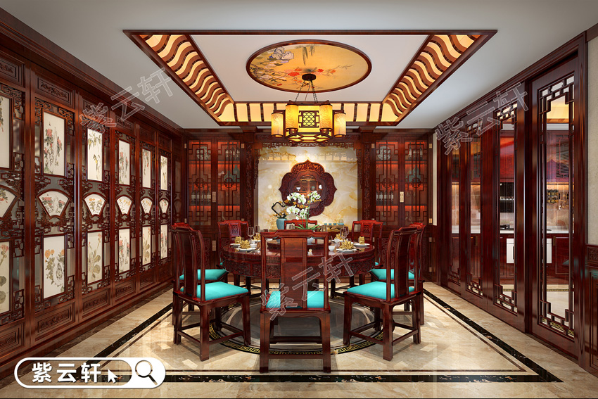 餐厅,餐厨一体的设计使空间层次丰富立体,一扇玻璃推拉门将厨房用途出纳通分割开,避免油烟散发,在背景墙处设计了一处花型木雕壁画,增添了浓郁的古典中式氛围,墙面采用红木保护墙的装修,从中设计中式彩绘画用以展现传统技艺的高超。