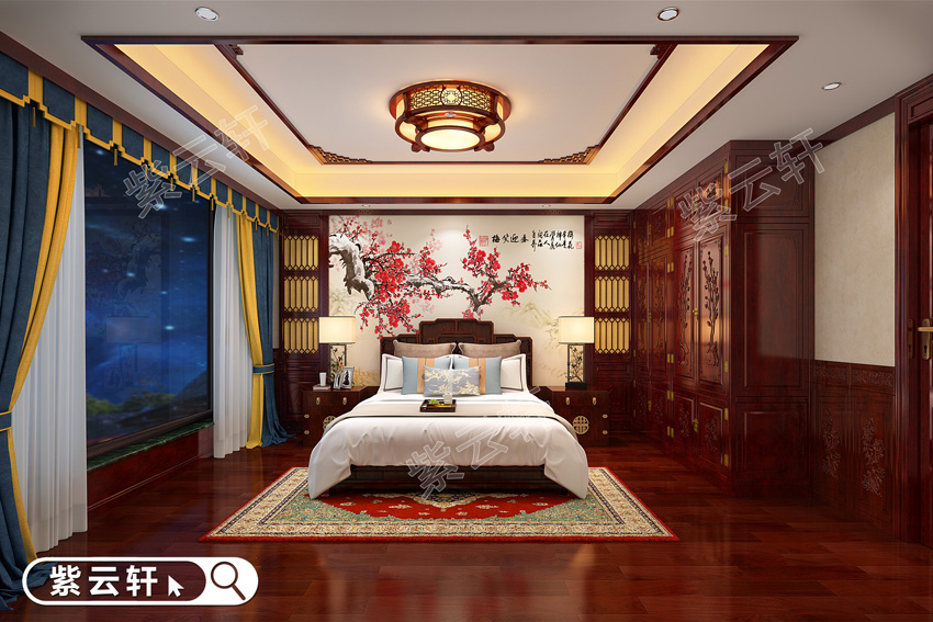 次卧,中式装修卧室选用大面积红木色调为主,生动展示了传统家具的古典气息。素雅的床品带来清爽感觉,床头以红梅图案作为装饰,红木挂落作边框,呈现出形象的古典家居生活,整扇大玻璃窗将窗外景色倒映在室内,同时也给室内带来通透明朗的效果。