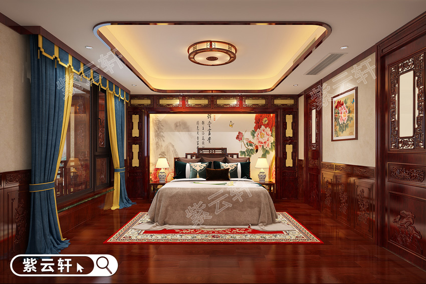 卧室,明亮的灯光将卧房渲染出一种温雅的气息,而大面积的床头背景墙上生动而形象的牡丹图,也将给予房间更多的灵动感与设计感。值得一提的是极具复古性的顶灯,红木元素的运用,带着古典宫廷华贵感的中式卧室完美的呈现出来。在中式别墅设计装修中享受古典浪漫的气息,不仅创意十足,还颇具趣味。