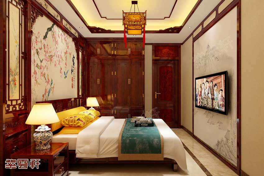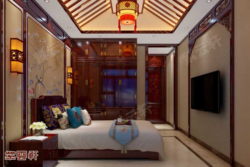卧室,利用红木线条做了背景墙分区,对称的设计中装饰古典风墙纸,让空间更具层次感。衣柜也延续了红木原色,同步在墙边,形成色彩呼应,让空间多了几分优雅与复古,效果更和谐。中式设计对空间的整体要求要协调统一,更能展现中式家居的魅力。