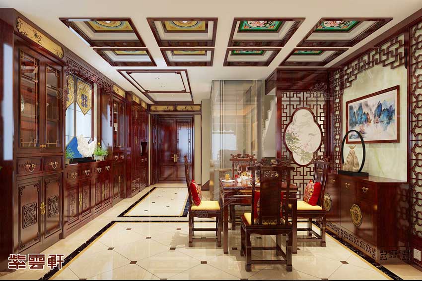 餐厅,作为客厅空间的延伸,用餐区既与客厅保持连贯的视觉风格,也有独立的实用功能。室内中式装修中,宽敞的空间会保留了充足的过道空间,又确保了与客厅之间没有多余的遮挡。背景墙以手工雕刻拼装的红木花格,加上隔板和水墨刮花让墙面得到美化。