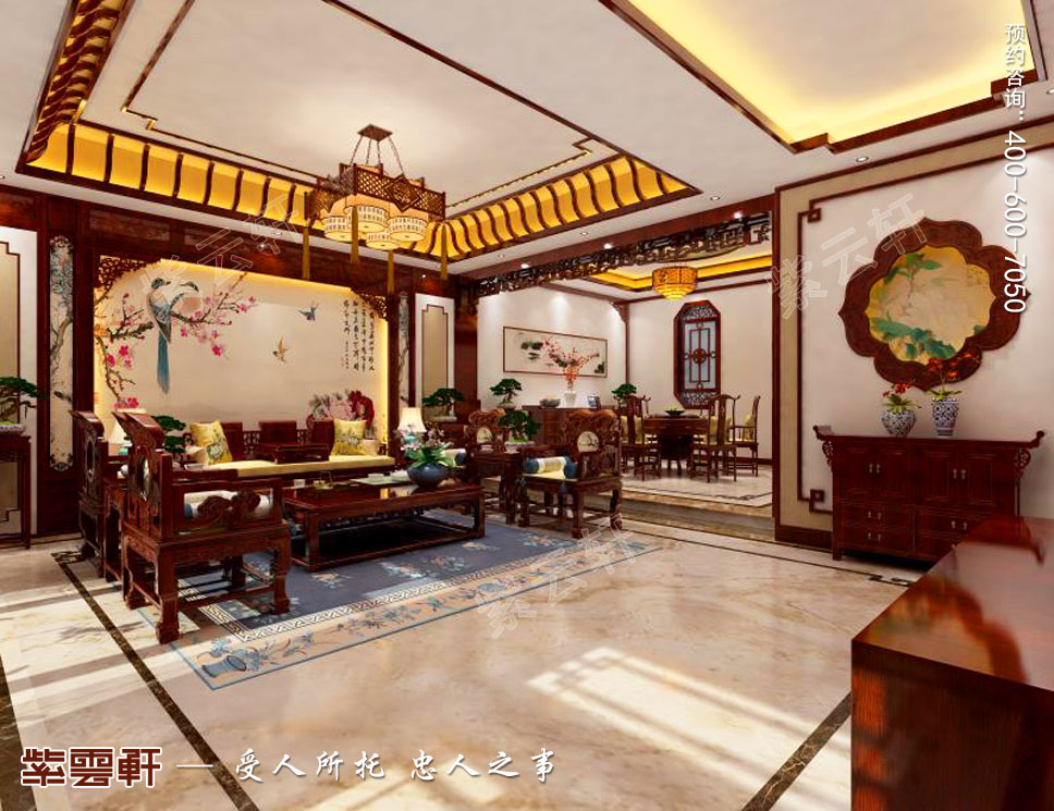 传统装修颠覆传统认知,延续东方美学的脉络之上,采用红木独特的肌理与颜色,打造一个中式雅致空间,再配以雕刻技艺作为空间的线索,贯穿其中,中式别墅室内装潢呈现古香古韵的氛围,更展现家的温馨氛围。