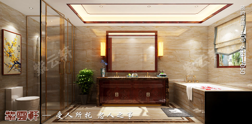 卫浴室,以保证私密为前提,中式卫浴室通过造型、色彩以及装修材质给人内敛朴质的感觉。传统的红木设计及暖色调的瓷砖设计,都能很好地体现中式装修的风采。浴室干湿分离的设计更好地完善了空间功能,在一派清新典雅的氛围下呈现出传统中式的独特质感。