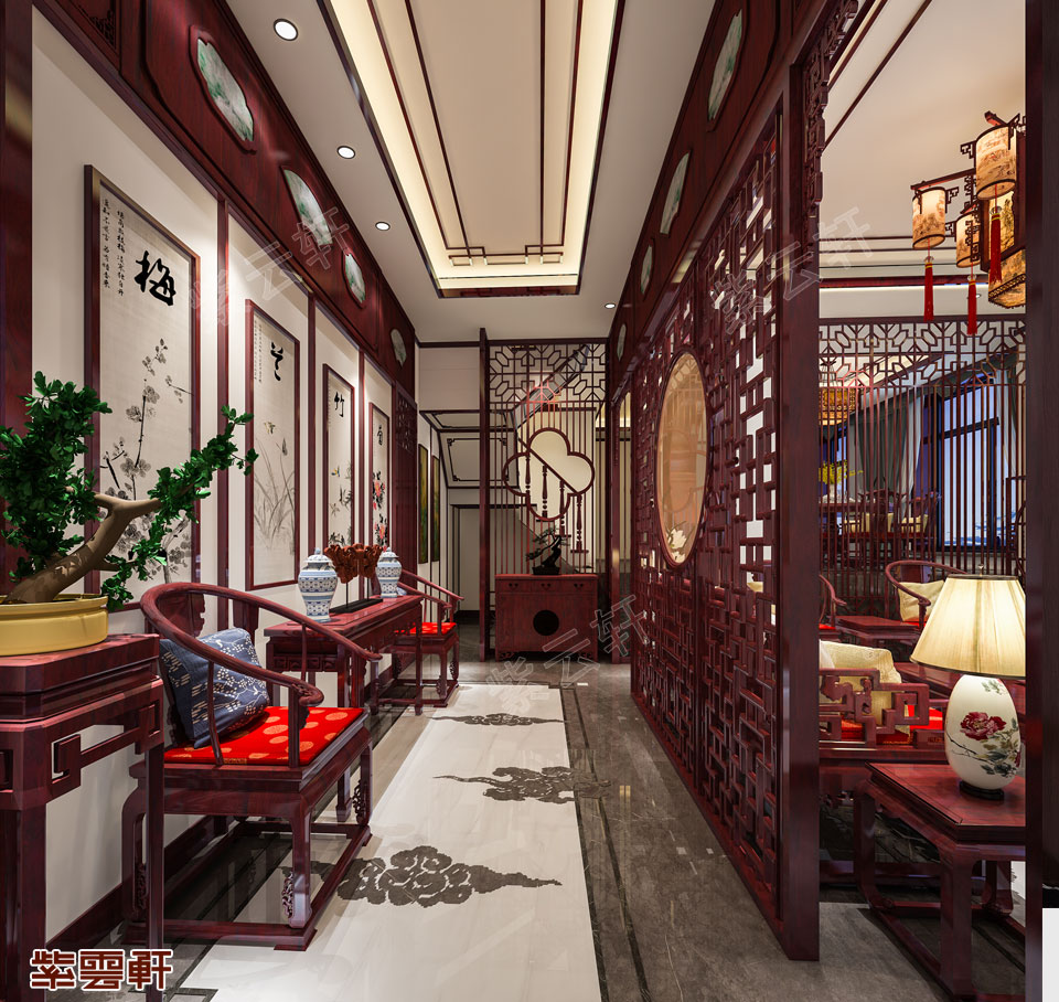 红木栅格做成的半隔断,既保持空间的通透性,又含有传统意境的朦胧感。高档的红木材质带有一种无声的力量,在朴素的颜色下表达空间的极高档次。四君子水墨画装点墙面,增添室内的儒雅之气。