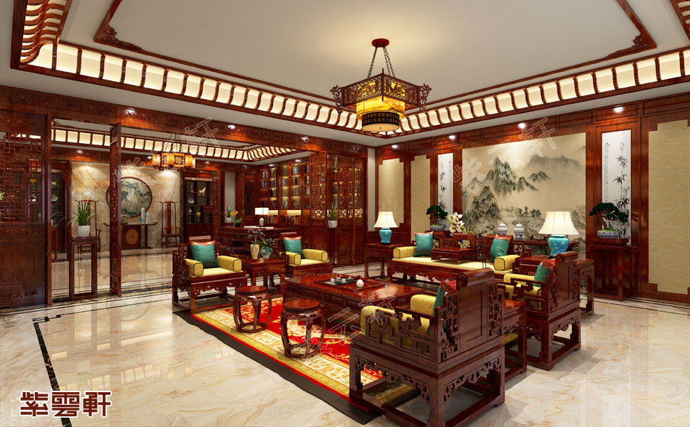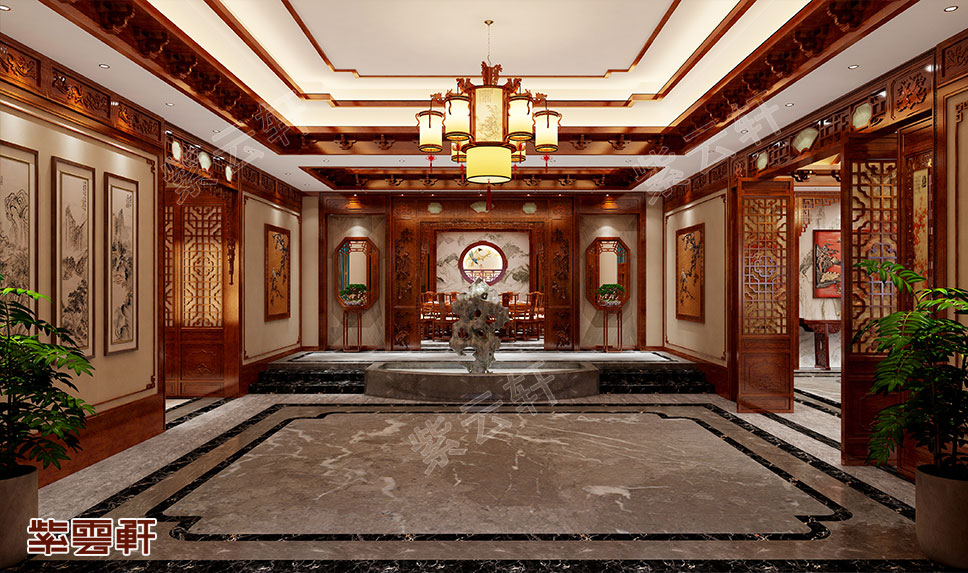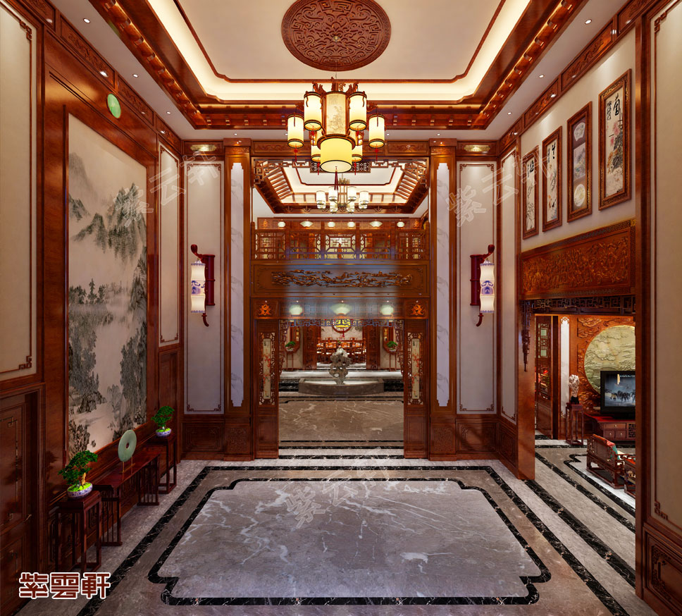 门厅,挑空式的空间布局,在一道道红木雕刻的背景装饰木板下,用雕刻经典花纹让空间显现岁月悠然的历史沉淀感。巨大的山水画背景墙,在广阔的空间中呈现意境悠长的中式艺术空间氛围。别墅室内装潢每个细节处的构思都有着美好的寓意,从中式画作中就能展现出来。