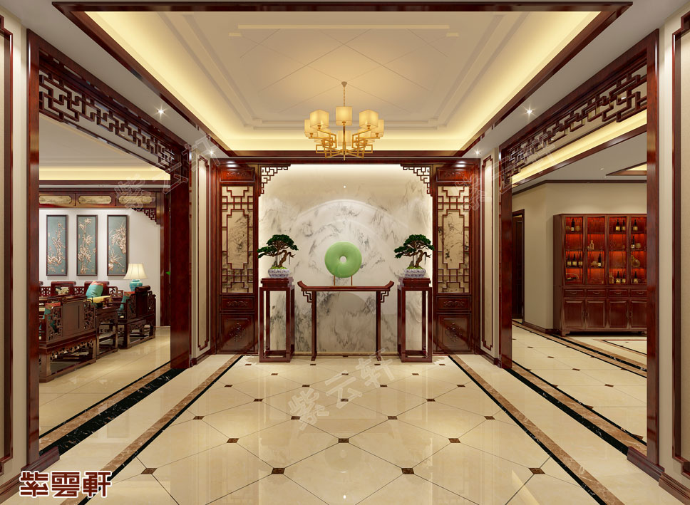 玄关,对称式的格局在细节上都非常考究,无论是玄关墙还是两侧的垭口花格,全都是成套的产品。红木花格加玉器陈列的玄关墙美观大气,顶部设计了射灯,可以起到灯光氛围的效果。