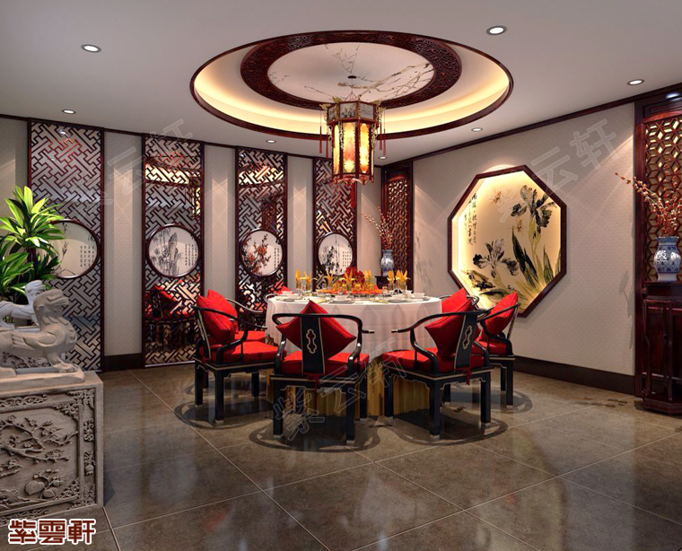 餐厅,墙面用花格护墙板做了中式风的装饰造型,中间圆形的艺术画突出中式的文雅韵味,天花板上也设计了水墨画,显得古风古意。中式设计选用深色木饰面搭配山水字画,体现出浓浓的中式气息,其中中式装饰元素起到不可忽略的作用。