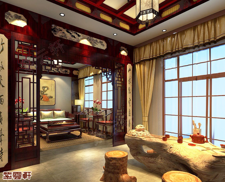 客厅,四合院设计中的客厅是最有传统韵味的一个空间,运用天然木材搭建的立柱,搭配色彩相近的红木家具,把中式的风雅展现出来,铺垫出沉稳尊贵的基调。客厅不算大也不算小,摆放合围式的沙发,更有亲近的氛围。天花板上的木格吊顶很有格调,细节质感不失雅致,安排在客厅刚好合适。