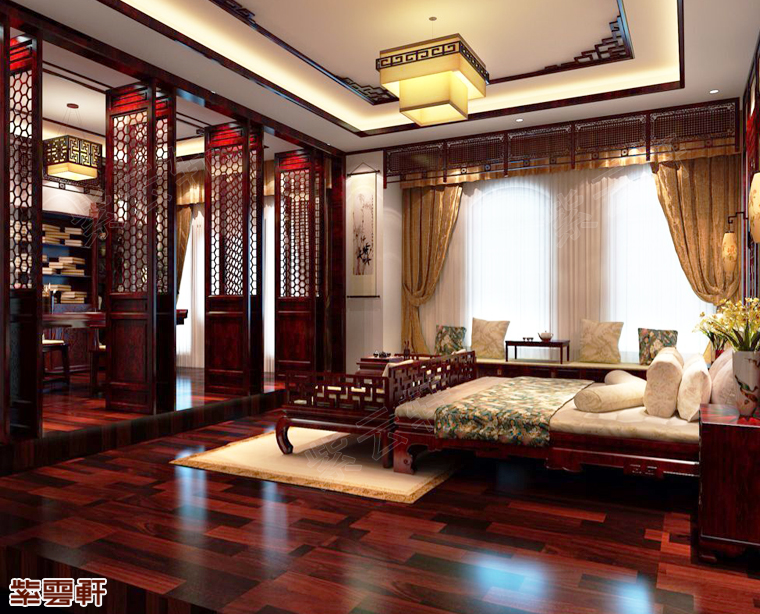 卧室,书房卧室一体也是四合院装修中的一个特色,因为空间非常的大,使用红木门对空间进行分隔,上面的红木花格将古韵味展现出来。传统风格的分隔以屏风与博古架为主,更能起到隔而不断的效果,具体可以根据业主的喜好进行设计。