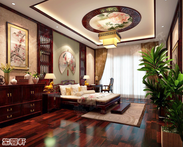 卧室,床头背景运用了中国传统设计,两侧格栅板营造出一种和平对称的视觉效果,中规中矩。大量的红木家具,现一种中国红颜色,在悄然间酝酿着质朴、典雅的中式氛围,中式四合院带来返璞归真的生活体验。