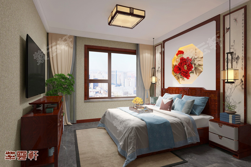 卧室,中式家居装修设计中的卧室多以简约格调为主,其中选用淡色的墙纸色系做底,加入适量的木质线条搭配,沉稳大气。吊顶是纯白的墙体,简洁素雅。大理石地板搭配护墙板,整体效果格外奢华。墙面装饰书画,带有中式文人的艺术情怀。