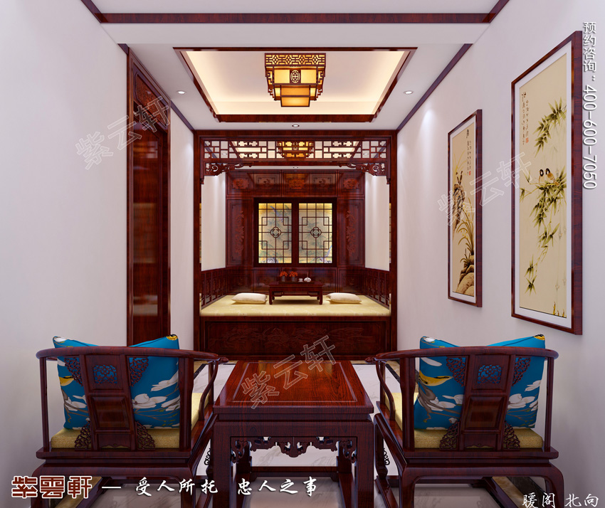 暖阁,不大的空间尽显私密温馨,整体上的直线条造型给人舒适的视觉效果,古典恬静的榻榻米设计提供了休闲惬意的空间感,精致巧妙的窗柩与挂落装饰形成了一种古朴纯粹的景点设计,休闲处的圈椅组合增添了整体空间的层次性与功能性,中式设计暖阁将待客休闲娱乐融为一体,组成了一处独立的区域。