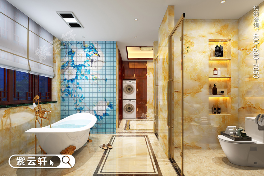卫浴室,为了方便打扫,卫浴室通体使用大理石瓷砖进行铺设,浴池能更好的享受生活,时尚大气之感不言而喻。