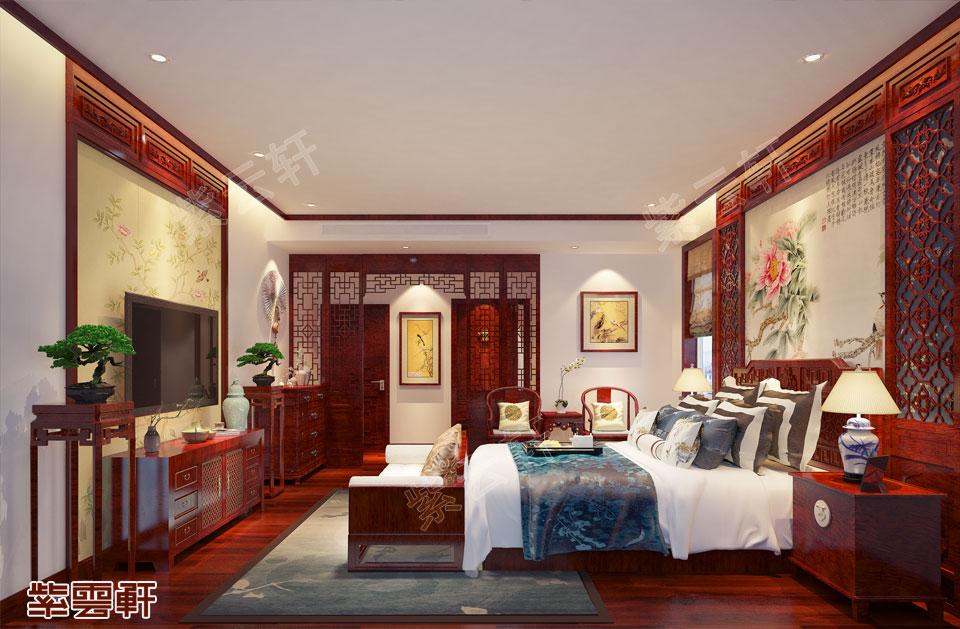 卧室,吊顶简约设计了一圈木质线条做框边,让卧室看上去更加简练。墙面上适当部分装饰花格板,表达中式雕刻元素与高档观感。地板与床铺、柜子的材质颜色都相近,大量的木质元素,营造一个自然朴素宁静的睡眠空间。家庭装修设计卧室以温馨为主,打造远离热闹街市的优雅之居。