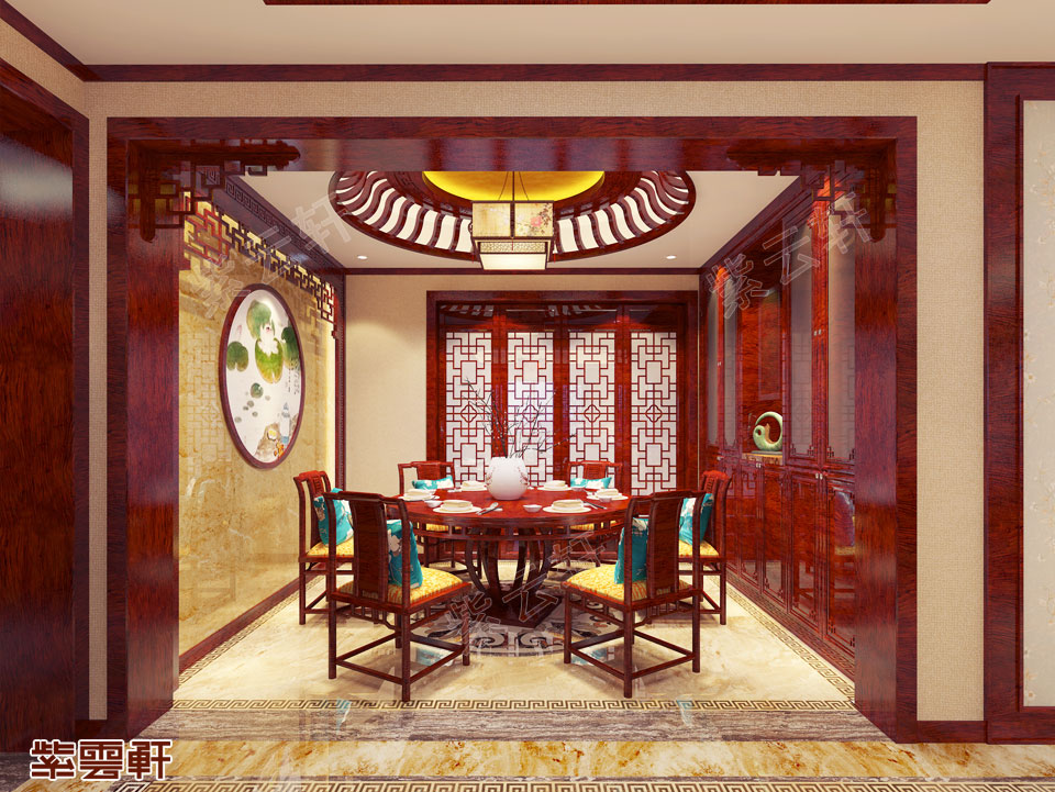 餐厅,墙面打了一面餐边柜,颜色饱满的红木材质非常有质感。精致的吊灯与灯带柔和空间气质,墙面则用大理石与圆形的中式画做造型,醇厚的红木餐桌摆在中间,与其呼应的吊顶也选用圆形红木线条,体现中式装修的对称美,整体高雅祥和的用餐氛围极具仪式感。