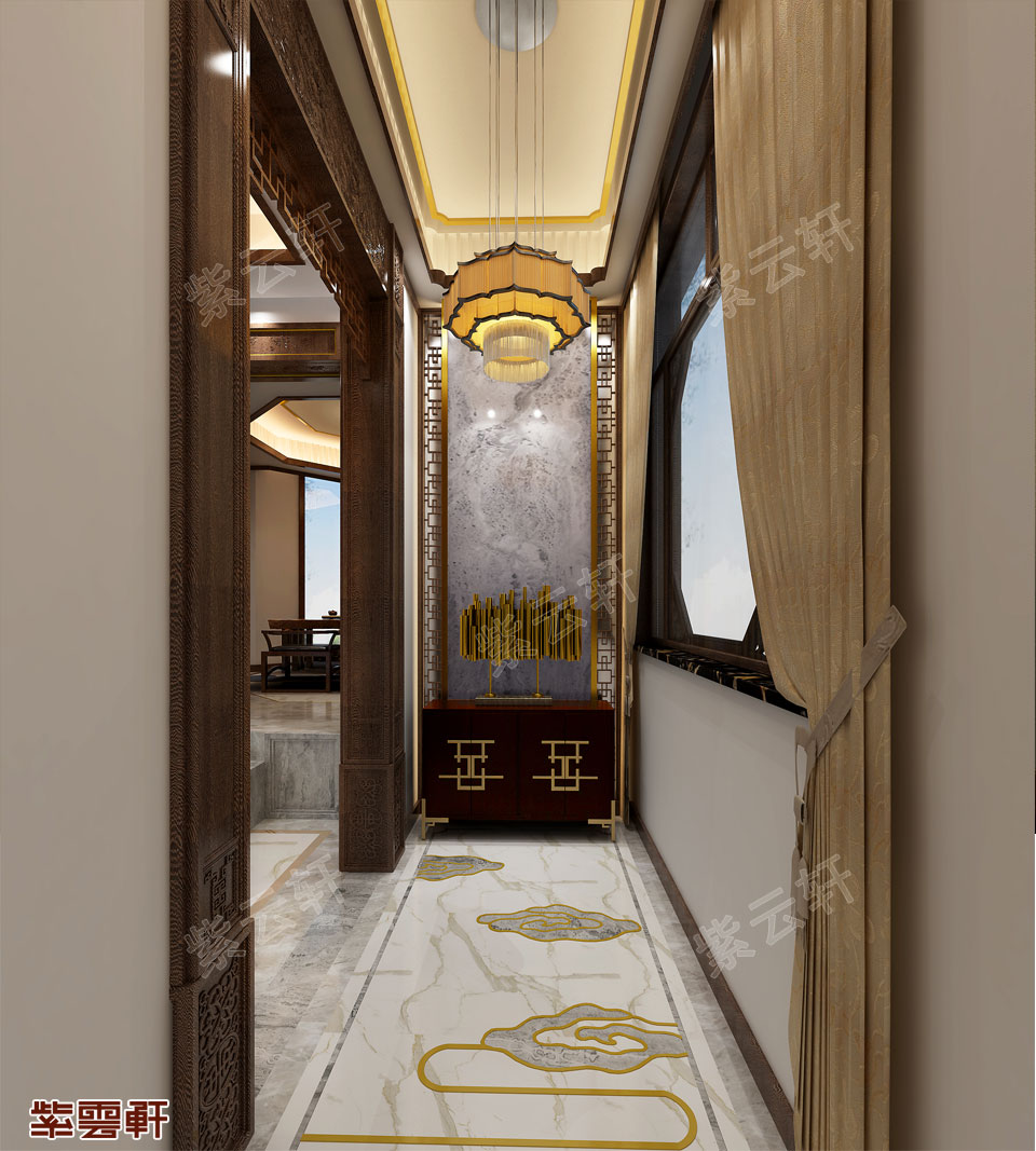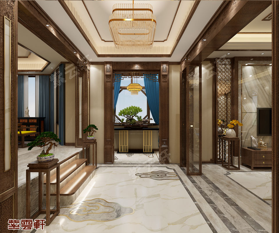 玄关,走进玄关一面奢华的木饰风玄关墙彰显豪宅气质,装饰柜与米白色墙体形成鲜明对比,结合花格造型独特的线条感,别具一格。中式风格家装定制的吊顶丰盈空间的层次感,柔和的灯光,使得整个空间设计都很静谧。