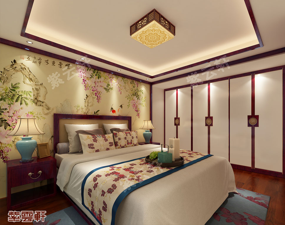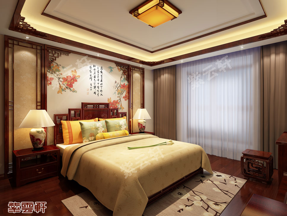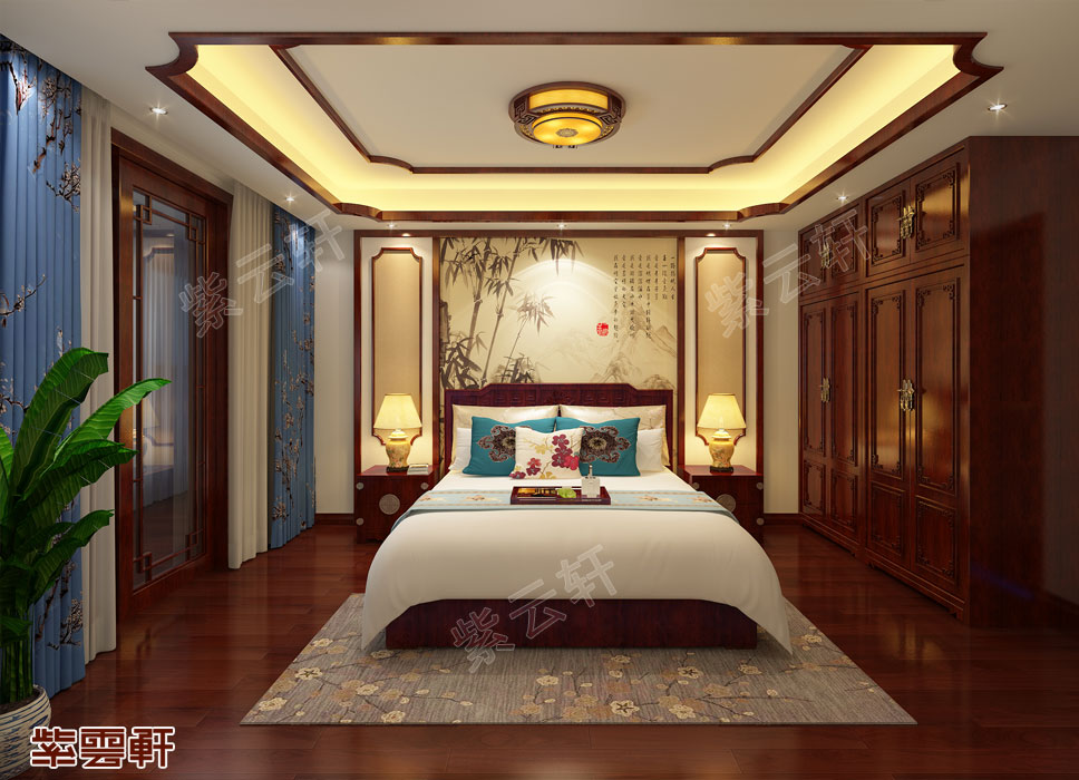 卧室,为了营造出理想中的中式空间效果,别墅装修卧室选择方正的中式墙画搭配对称的木格墙面造型做背景墙,造型简单的床头柜与衣橱非常朴素,减少空间的复杂线条,不会让人感到烦乱,满满的温馨气息。