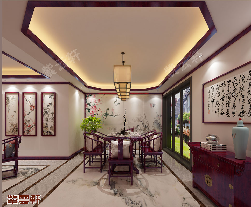 餐厅,厨房与餐厅间可以通过透明的玻璃在视觉上链接,扩宽餐厅的范围。作为主角的红木餐桌座椅造温馨简约,天花板上用木饰面与石膏线做造型,周围隐藏了射灯与中央空调,干净整洁。中式设计风格的餐厅更有一种复古的气息,更有一种穿越的感觉。