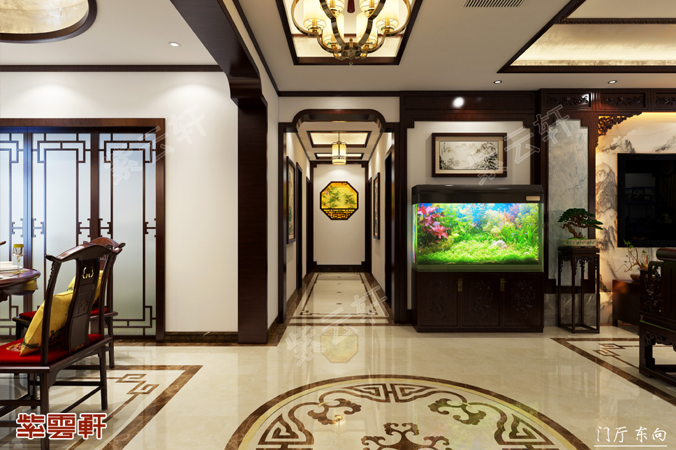 门厅,走廊的墙面都挂满了中式画,小巧的空间表现得犹如画展一般,深刻的中式风情以水墨笔韵的方式展现出来。走廊的尽头运用木格元素设计了一套艺术墙,有种小巧精美的精致感,温情优雅而华丽。鱼缸的摆放为中式装修增添了一抹时尚气息,也让整个家居更加的灵动。
