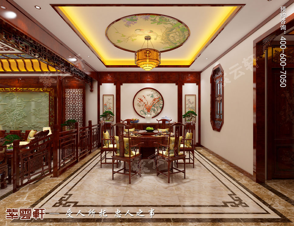 餐厅,空间中极具整体性,线条流畅的餐画作确定了整体空间的基本格调,空间背景处运用古典壁画装点空间层次,留白处突显出传统东方意蕴,轩窗的设计增添了一种优美中式意境,在留白中加入一点装饰打造的中式装修风格的餐厅有一种浓郁温馨的氛围。